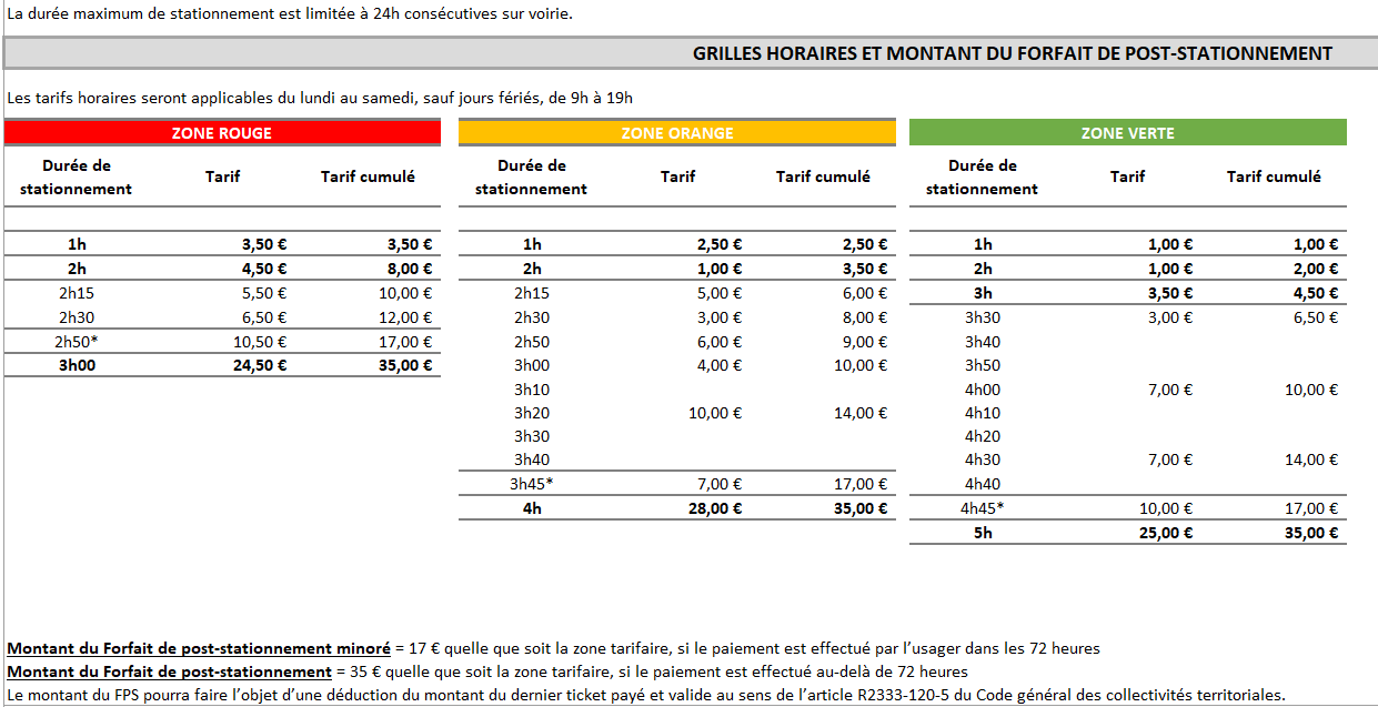 durées maximum en vigueur selon les zones tarifaires (3 heures, 4 heures